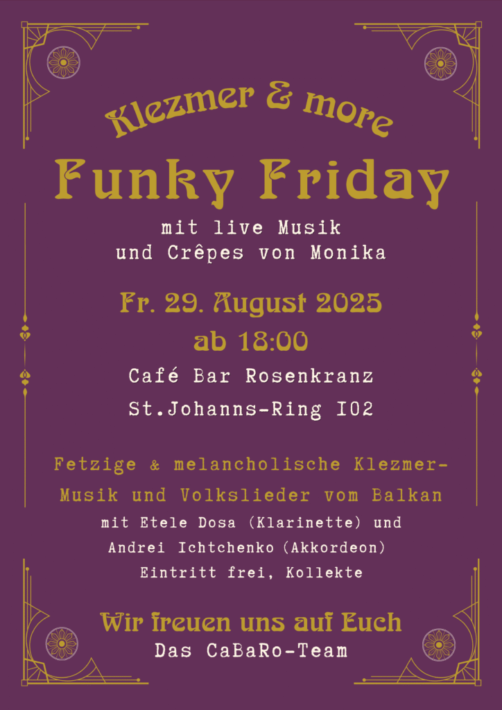 Live-Musik und Flammkuchen gibt es in der Café Bar Rosenkranz am Freitag, den 27. Juni 2025. Ab 18 Uhr erklingen fetzige und melancholische Klänge. Das Duo spielt Musik und Volkslieder aus dem Balkan – Klezmer-Musik eben. Das Duo sind Etele Dosa (Klarinette) und Peter Dellbrügger (Klavier). Der Eintritt ist frei,